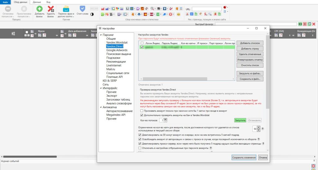 Важно: аккаунты ОБЯЗАТЕЛЬНО должны быть не важными или новосозданными. Все аккаунты при автоматизированном парсинге, в т.ч. через Key Collector, сильно рискуют получить бан! Не используйте ваши основные аккаунты с зарегистрированными Яндекс.Метрикой, Яндекс.Вебмастером и другими важными сервисами Яндекса!