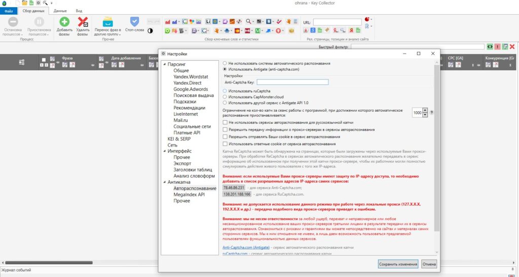 Переходим ко второму этапу настройки Key Collector – антикапча – в этом же окне программы одноименный пункт. Нам предлагается на выбор несколько сервисов: Anti-Gate, ruCaptcha, CapMonster.cloud и другой сервис.