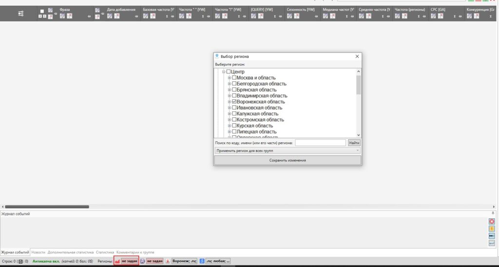 Наши специалисты крайне рекомендуют ограничивать сбор региональными рамками (если сайт компании работает только в определенном городе, области и т.д.) для сбора более точного семантического ядра. Но если же ваш сайт однозначно рассчитан на всех пользователей ПС Яндекс, то пропустите действия из абзаца выше.