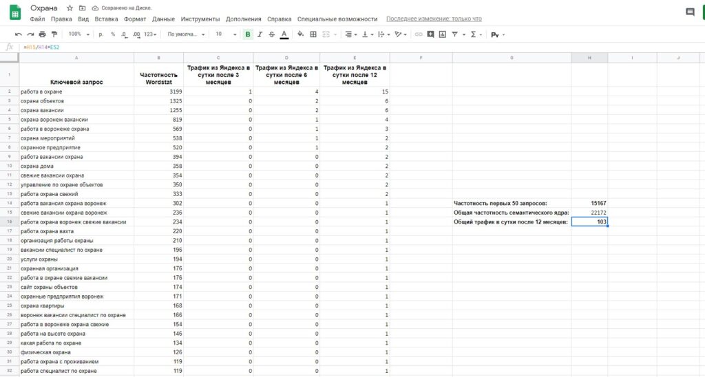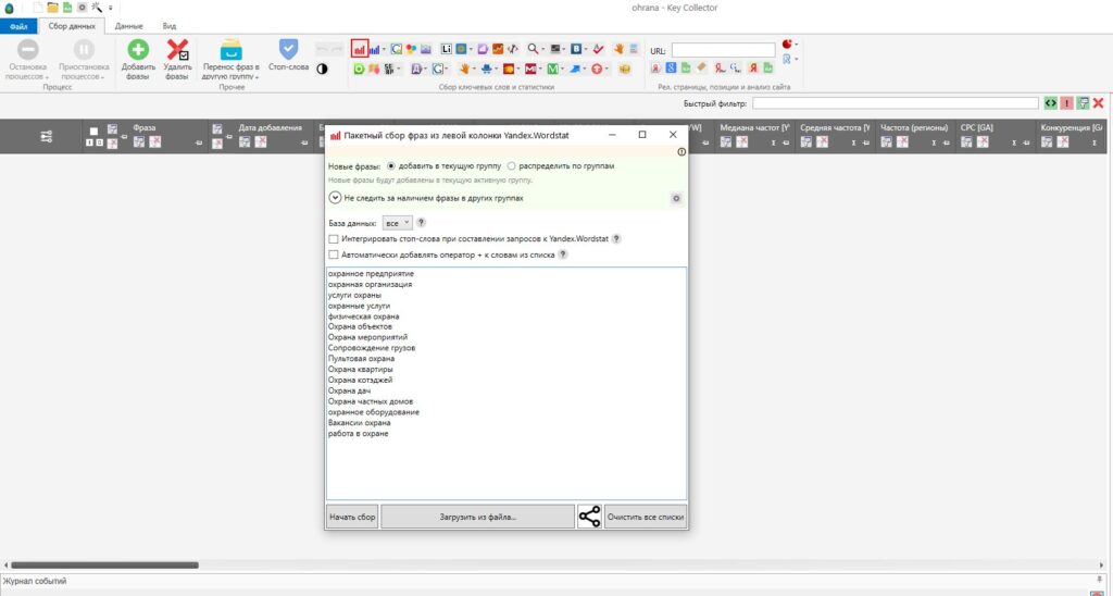 В примере из скриншота выше собран базовый список ключей для сайта нашего клиента в тематике услуг частной охраны.
