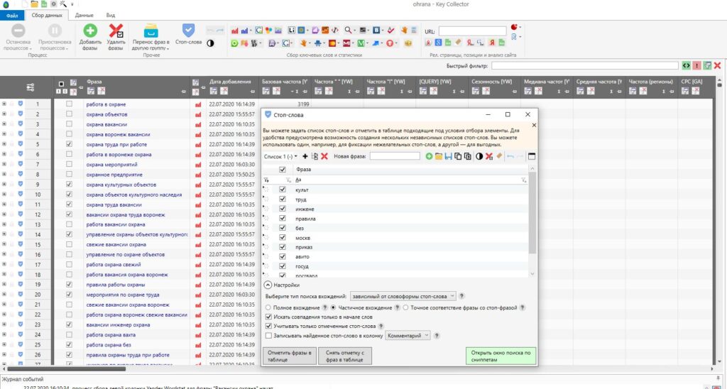 После нажатия кнопки «Отметить фразы в таблице» произойдет пометка галочками фраз, содержащие стоп-слова в соответствии с выбранным режимом отбора. Далее эти слова можно удалить, нажав на соответствующую кнопку, или перенести в другую группу, также нажав на соответствующую, если с этими словами предполагается еще дальнейшая работа.