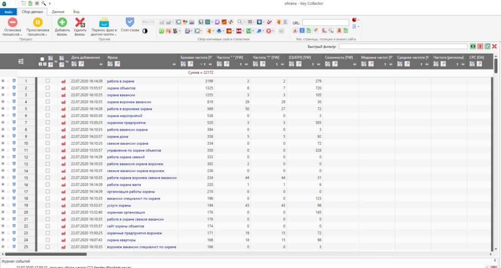 Прогресс сбора, как и дальнейшие процессы работы с Key Collector, можно отслеживать во вкладке «Журнал событий» в нижней части окна программы. Результатом этапа станет список всех возможных вариаций введенных базовых запросов, расширенный дополнительными словами, а также с указанием базовой частотности каждого такого запроса.